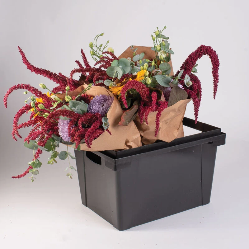 An all-in-one flower harvest, transport, and display system that provides optimal conditions for cut flowers on each leg of their journey. The main components of the Procona System are: 1) a plastic container that can be filled with water and flowers; 2) a cardboard collar for increasing height and protecting blooms during transport; 3) and a ventilated lid that provides a stable base for the next row of stacked containers. The small container footprint allows for high loading capacity, and the side and top ventilation allows all flowers to receive adequate air flow to stay fresher longer. Once flowers arrive at market, simply remove collars and lids for a beautiful display. A variety of sizes and collar heights in two Procona Series (Florida and Valencia) are available to accommodate different flower sizes and stem lengths. Procona containers can also be topped with lids to create professional, reusable vegetable CSA boxes.